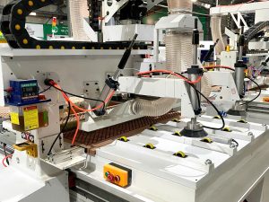 | Hệ thống gắp, nhả phôi tự động, căn chỉnh tự động | Tự động gắp và nhả phôi. 2 xi lanh hơi gắp ván , có chốt định vị và xilanh hơi căn chỉnh ngay ngắn ván trong khổ bàn làm việc |